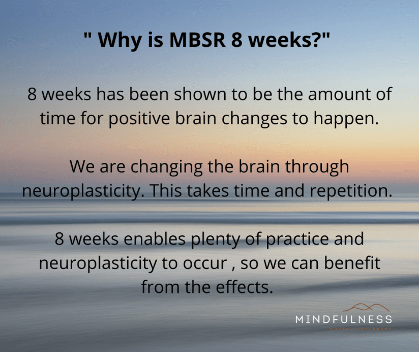 BRAIN CHANGES THROUGH NEUROPLASTICITY The 8 weeks allows for the daily practices to start making actual changes to the brain via neuroplasticity. It leads to measurable changes in brain regions associated with memory, sense of self, empathy, and stress as well as improving the immune response in eight weeks.